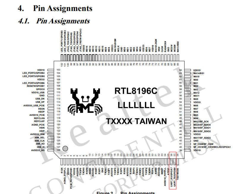 La datasheet contient le détail de l'assignation des pins sur la puce. Tout en bas, se trouvent les 2 pins RX/TX de l'UART. Ayant déja déterminé le RX, j'ai pu simplement valider le pin associé au TX en effectuant à nouveau un test de continuité.